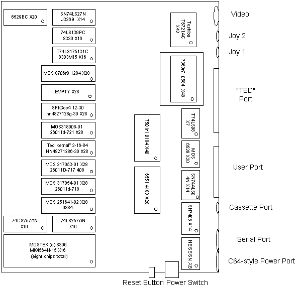 To the right, we have a back picture to show the ports. From left to right, they are power, serial, cassette, user, TED (expansion) port, joystick 1, joystick 2, video DIN, and the composite RF port. On the RHS are the power and reset buttons.