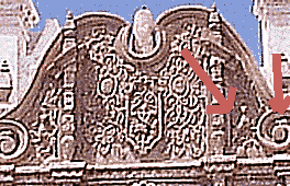 Tucson has many very beautiful catholic churches around town. None is older, however, than the San Xavier Mission. Notice that the right tower is incomplete. This is because the Spanish stopped construction when the indian workers, who were putting up the second tower dome, kept falling to their death. To the right, here, is a closeup of the area in the upper middle. If you look closely where I have put the arrows, you'll see a cat near the top of a swirl, and a little mouse inside the swirl. According to the local hispanic community, should the cat ever catch the mouse, the world will come to an end. Since I am not quite sure whether the world is coming to a good end or a bad one, my hopes go with the mouse.