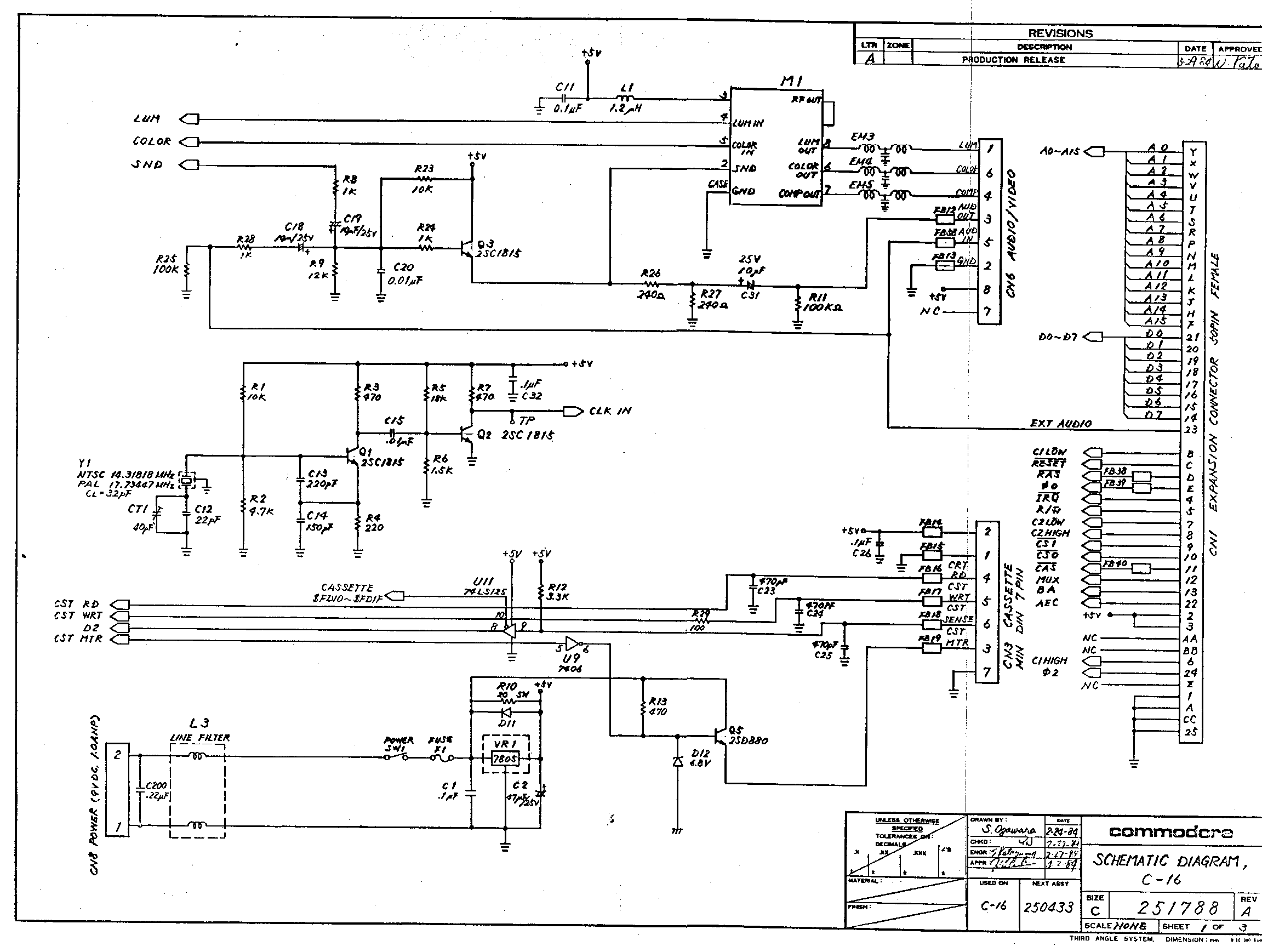 Commodore 16 schematic 251788, sheet 1 of 3. Expansion port, cassette port,