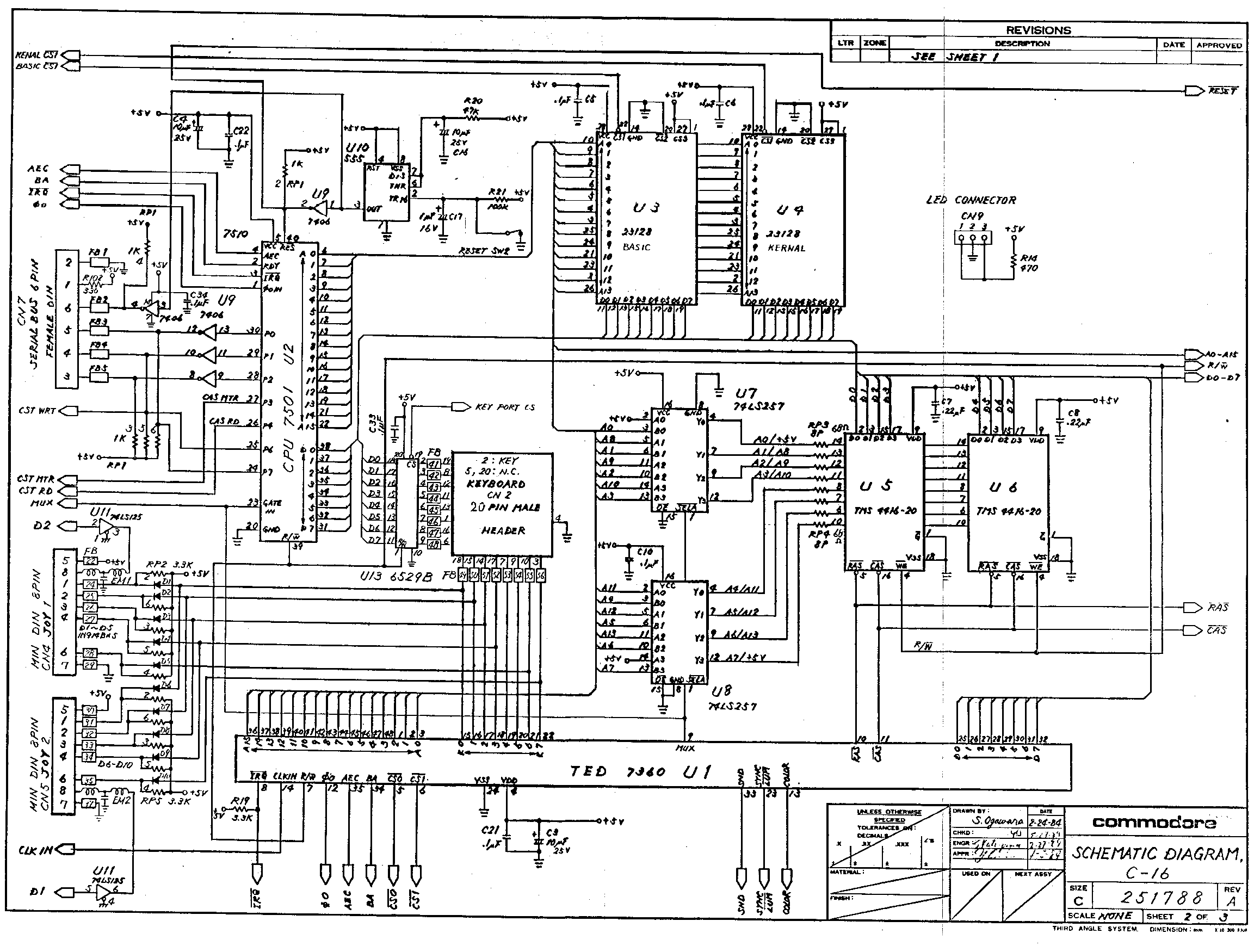 Commodore 16 schematic 251788, sheet 2 of 3. TED, processor, joysticks,