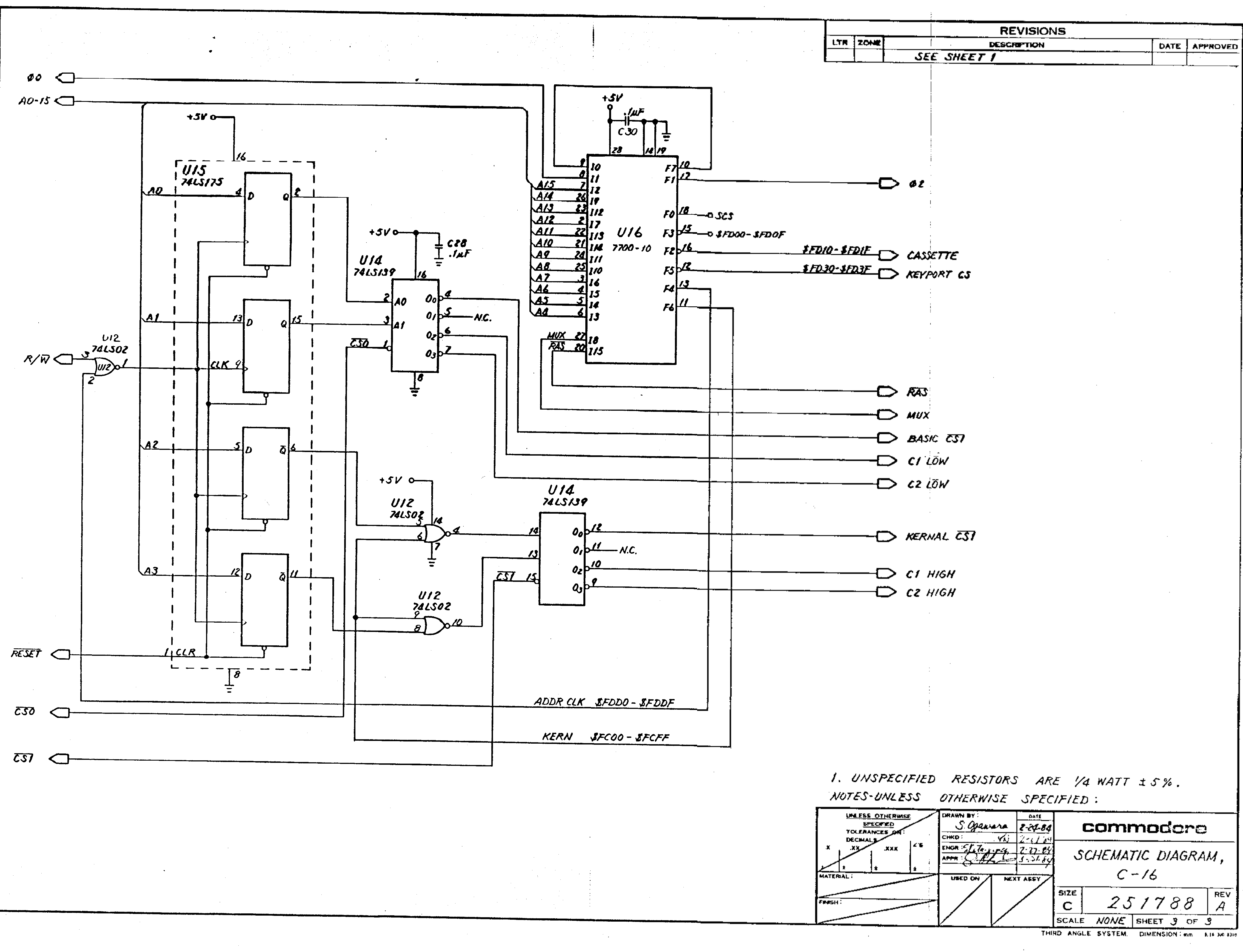 Commodore 16 schematic 251788, sheet 3 of 3. PLA and address decoding.